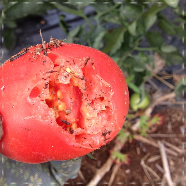 2014/07/10 Category : 記録 トマト to トリ。 去年の台風の時に、破れたハウスの屋根(のビニール)。 その後、補修用テープで”簡易”に直したのですが、 この台風で、すでにテープ剥がれ始めてるよ!! 私に出来ることも限りがあるので・・・、補修できるかどうか・・・。 というわけで、トマトの話題です。 トマトは、ハウス栽培しており、(と言っても、厳密に密閉されていませんが) 防鳥ネットで覆ってはいるのですが、どうやらいい感じの隙間があるらしく、 鳥が日に何個かは突っついているのです。 ↑一回落ちて土が付いてますけど; でも、全てやられるわけではなく、どうやらそのいい感じの隙間があるところ付近だけ 突っついてるみたい。(すぐ逃げられるようにあまり遠征しない模様。) なので、隙間を自分なりに埋めてみたが、果たしてどうか・・・。 鳥(特にカラス)には悩まされますが、鳥たちも生きるために必死よね。 お互いさま。 愛媛の野菜、みかん販売中~。詳しくは上記[ご注文/お問い合わせ]にて^^ [0回]PR