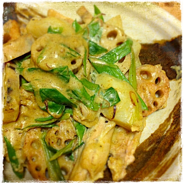 2013/12/26 Category : メニュー 鶏とレンコンの豆乳カレー炒め 我が家の冬の定番メニュー♪ 旬の安いレンコンがたっぷり手に入ったら、たっぷり作って・・・ も、すぐ無くなってしまいます^^ ✿ざっとしたレシピ✿ ◎材料 ・レンコン ・鶏肉の手羽元(モモ肉、豚肉、猪肉でも可。肉系なしでも大丈夫^^) ・青ネギ ・豆乳 ・カレー粉 ・塩、コショウ ・ニンニク ・ショウガ ・ナンプラー ・油 ◎作り方 レンコンは一口大に切って水にさらす。 みじん切りしたニンニクとショウガをフライパンにて低温の油で炒めて香りを出す。 レンコンを入れてじっくり火を通す。 肉、カレー粉を入れて炒め合わす。 軽く塩、コショウをする。 豆乳を投入してトロッとするまで中火でしっかり煮込む。(焦げに注意) 仕上げにネギとナンプラーを入れて味を馴染ませる。 出来上がり♪ カレーとナンプラー、そして煮込むことでレンコンがもっちりとして、食欲をそそる一品です レンコンの粘り成分ムチンは、食べ過ぎた胃腸を労わり、脂肪やたんぱく質の消化を助けてくれる働きがあるので、胃もたれや消化不良に効果があるそう。ビタミンB群やCも豊富なので、昔から風邪ひきの時にも漢方使いされてきました。レンコンをすりおろしてスープにすると、心身ともにほっこり~~~ 大三島ではあまりレンコンは作られていませんが、今治では「鳥生のレンコン」が有名です^^ 愛媛の野菜、みかん販売中~。詳しくは上記[ご注文/お問い合わせ]にて^^ [0回]