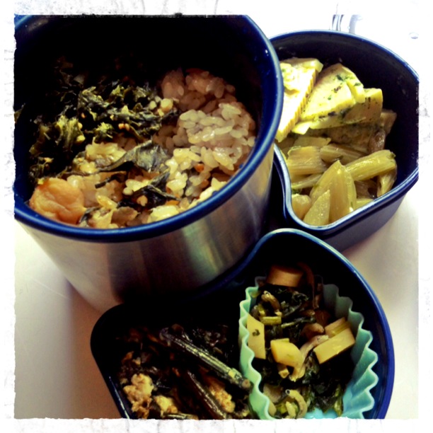 2014/04/19 Category : メニュー よもぎの炊き込みご飯 畑に毎年たくさんのよもぎが採れます。 でも、時期が来ると剥き込んでしまったり、よもぎ餅を作るわけでもないので 大体そのまま放っておくことが多かったのですが・・・。 今年は、野草に目覚めていますので!何かよもぎで一品できないかなぁと さがしていたら、思いだした!フーチバージューシー。 沖縄料理で、よもぎと豚肉の炊き込みご飯です。 沖縄のよもぎは、本州のものとは種類が違うらしいですが、 大丈夫でしょう!ということで、たっぷり採ってきて、早速作ることに。 初めて作る時は、一応アクを懸念して、さっと湯がいてから炊き込みました。(写真上) これでも、ふんわりよもぎの香りがして美味しい! 具は、よもぎ、豚肉のこまぎれ、にんじん、あぶらあげ。 味付けは、米1合に対して、しょうゆ約大1、お酒大2、みりん約大1、塩は少々。 ・・・と。 今度は生のままで炊き込んでみました。 お弁当に詰めて^^ 蕗の葉味噌と梅干しに隠れていますが、フーチバージューシー^^; 生葉を入れた方が、やはり香りが良いかも。 他のおかずは、たけのこの木の芽和え、蕗炒めのチーズ和え、 大根菜のふりかけ、ワラビの卵とじ。 春すぎる、お弁当で午後も元気に^^ 愛媛の野菜、みかん販売中~。詳しくは上記[ご注文/お問い合わせ]にて^^ [1回]